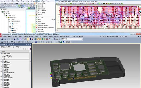 二维和三维统一的设计环境,帮助设计人员更直观的完成PCB设计,并且能够导入三维电子元器件库以及结构外形等进行模拟装配。