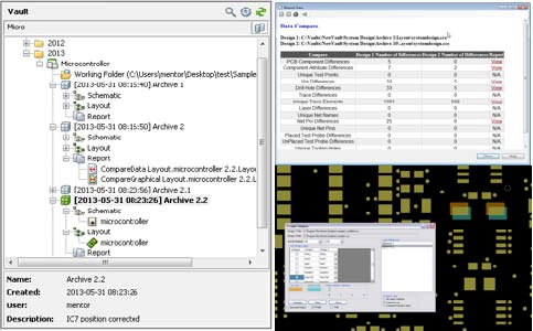 设计数据的版本管理对于产品开发非常重要,PADS Professional采用的自动归档技术允许设计人员通过自动备份或者手动备份方式对设计数据进行版本管理。而且还能对进入数据池的设计文件进行版本比较,快速找出不同版本之间的差异。